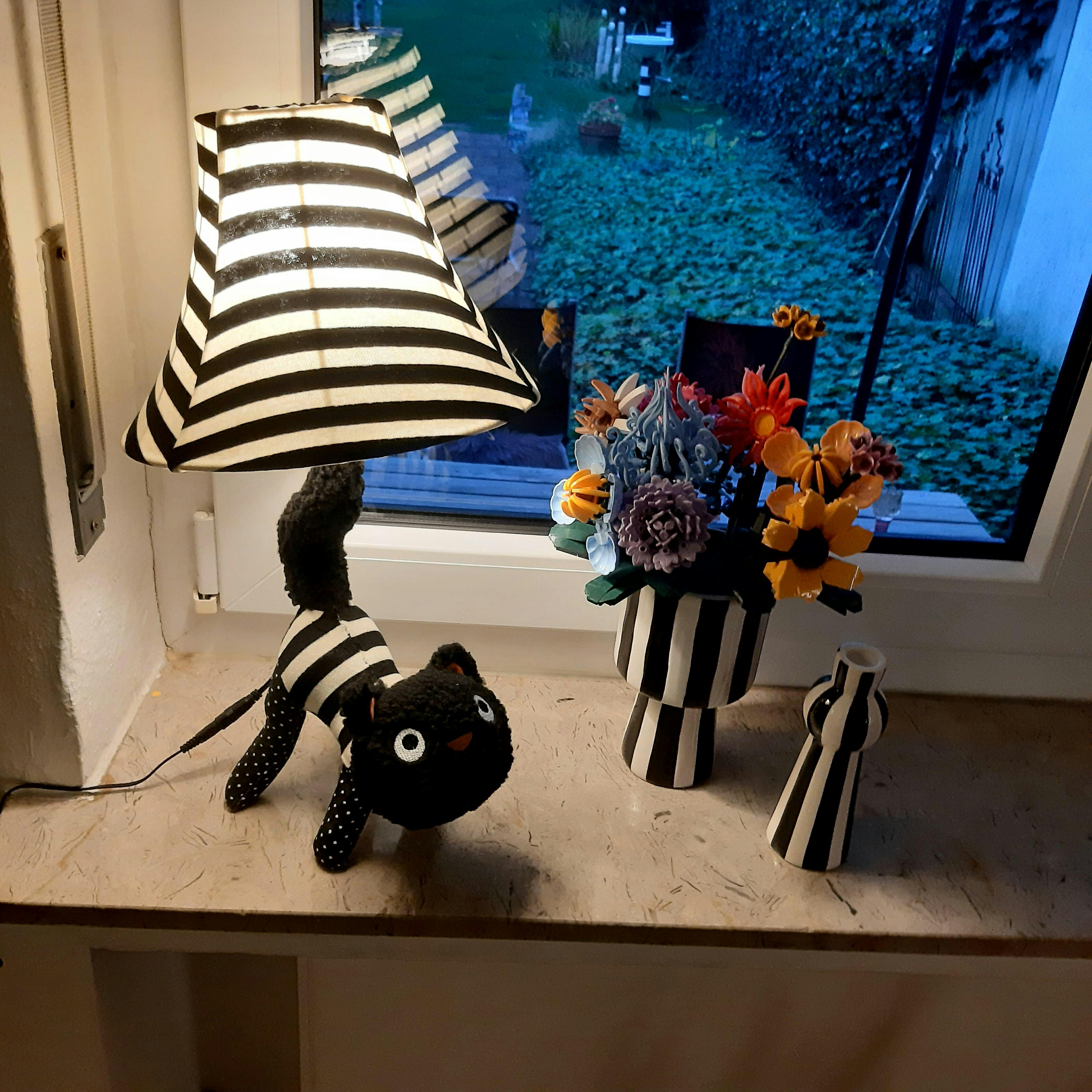 Mit ihren gepunkteten kleinen Beinchen, dem gestreiften Körper und Lampenschirm ist Luna ein richtiger Hingucker im Raum. Ihr Wollgesicht mit den gestickten Augen und dem Mund lässt sie unglaublich freundlich, niedlich und sympathisch wirken. Typisch für Katzen, die ihren Schwanz steil nach oben richten, ist Luna gut gelaunt und immer froh, dich zu sehen. Sie trägt darauf auch stolz ihren Lampenschirm und wartet, bis sie bei dir zuhause zum Einsatz kommen darf.