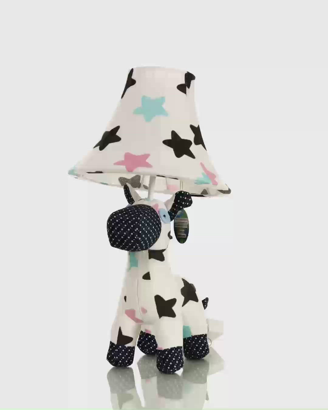 Finns Körper und sein Lampenschirm sind mit einem außergewöhnlichen Sternmuster bedeckt. Seine Ohren, seine Schnauze und seine Mähne sind dunkelblau-weiß gepunktet und seine bezaubernden Augen bestehen aus aufgenähten, hellblauen Knöpfen.